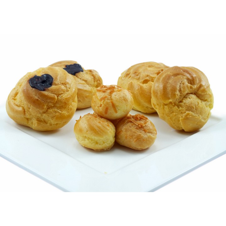 Assorted soes with sweet vanilla and cheese fla filling.