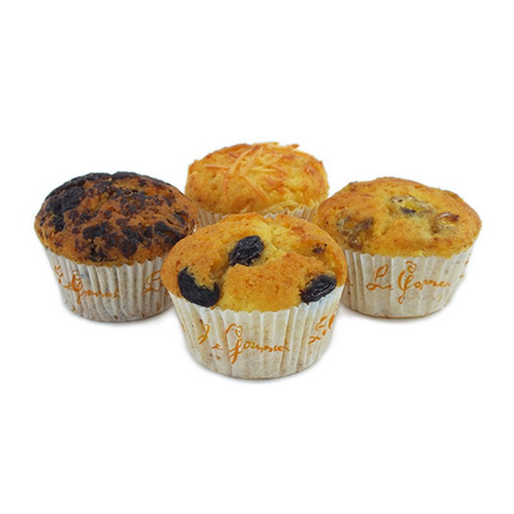A hearty Muffin with choco chip, sweet banana, cheese, and raisin topping selections are perfect for your coffee or tea companion.